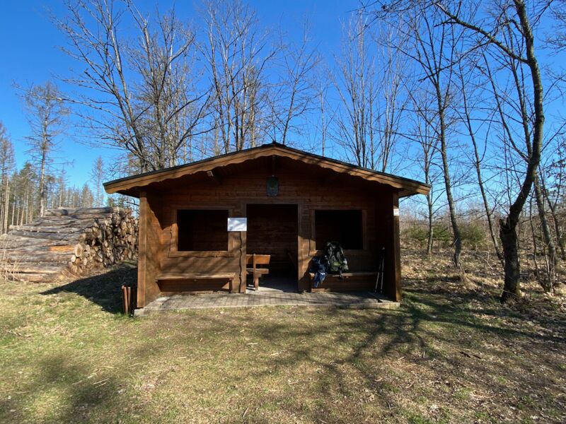 Vor mit taucht die Schutzhütte "Stehtischler Alm" auf, eine von soviel schönen Schutzhütten auf dem Lahnwanderweg.
