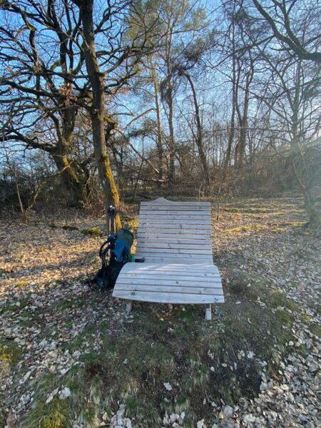 In der Ferne erblicke ich eine große Relaxbank direkt am Wegesrand. Wer braucht schon einen überfüllten Landgasthof wenn er mutterseelenallein sein Abendessen mit Blick auf dieses schöne Fleckchen Erde genießen kann. Da ich mich nur schwer von meiner Bank mit Aussicht trennen konnte, keimt kurz in mir die Überlegung auf meine Nacht hier zu verbringen. Aber auf Besuch von abendlichen Spaziergängern bzw. morgendlichen Gassigängern hatte ich dann auch keine Lust.