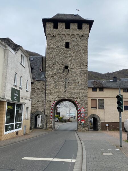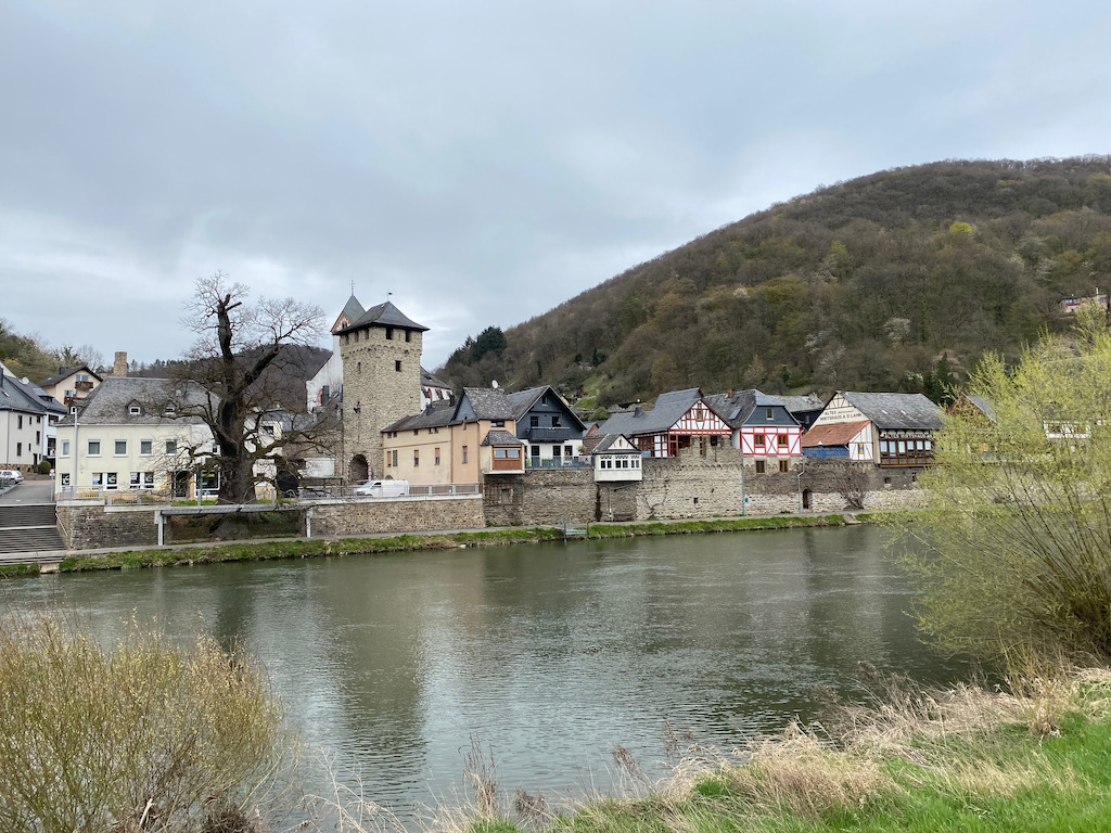 Mit Kuxlay haben wir den höchsten Punkt unserer Wanderung erreicht (348 m). Von hier oben aus geht es weiter durch den Wald und über breite Wiesenwege hinab nach Dausenau. Das wunderschöne kleine Dorf empfängt uns mit seinen prächtigen Häuserfassaden die sich wie Perlenketten an der Lahn entlangziehen. Auch hier müssen wir die Lahn über eine Brücke überqueren und stehen nach nur paar Metern im historischen Ortskern mit schiefem Turm und Teilen einer alten Stadtmauer.