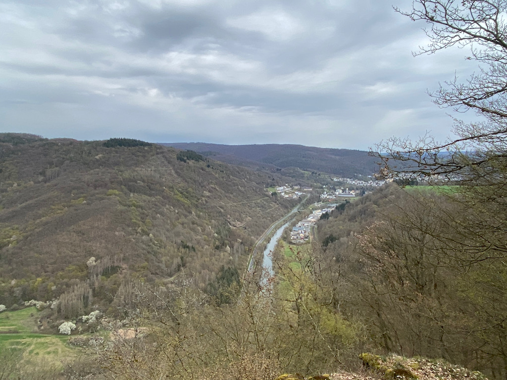 Beim Aufstieg nach Misselberg sind wir zumeist auf breiten Forstwegen unterwegs und blicken durch die dichten Baumkronen immer mal wieder auf der Bergfried der Burg Nassau. Wir wandern vorbei an Obstplantagen und, was wohl sonst, quälen uns mal wieder auf einem steilen Pfad hoch zum Aussichtspunkt Kuxlay. Hier oben weht ein kühler kräftiger Wind und wir nutzen die Pause zum anziehen wärmerer Kleidung und erfreuen uns dem famosen Ausblick auf das Lahntal.